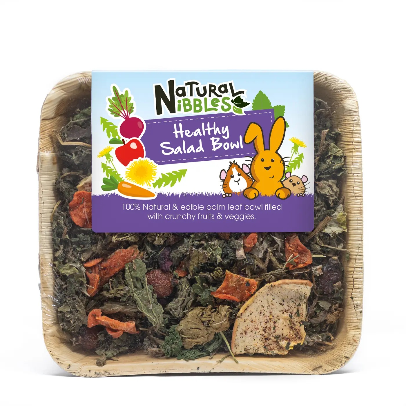 The PurePaws™ Healthy Salad Bowl is a wholesome, enrichment-packed treat designed to delight your small furry companions. Each bowl is made from a 100% edible palm leaf, filled with a nutritious mix of natural leaves, then topped with a colourful variety of dried fruits and vegetables — including favourites like apple slices and carrot.