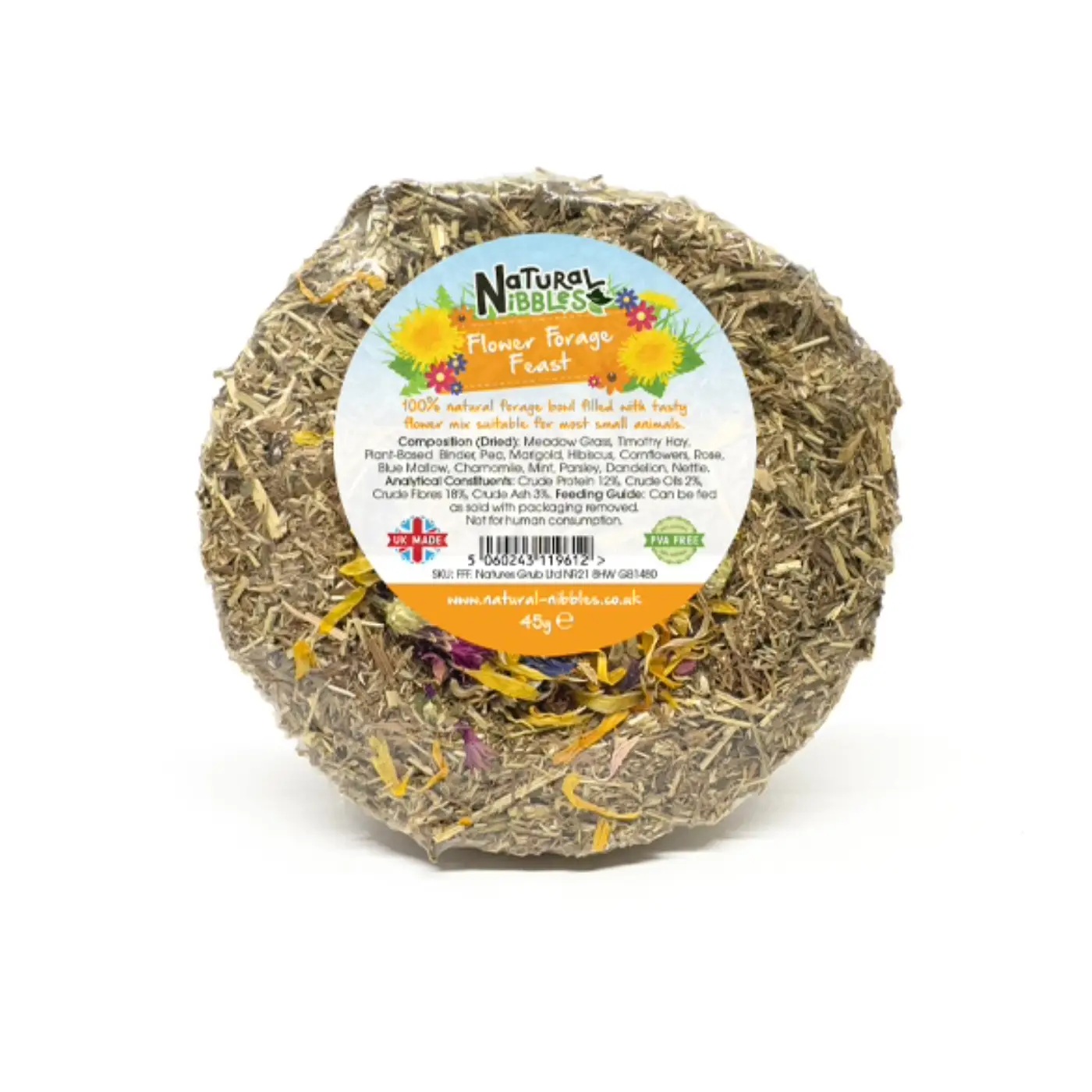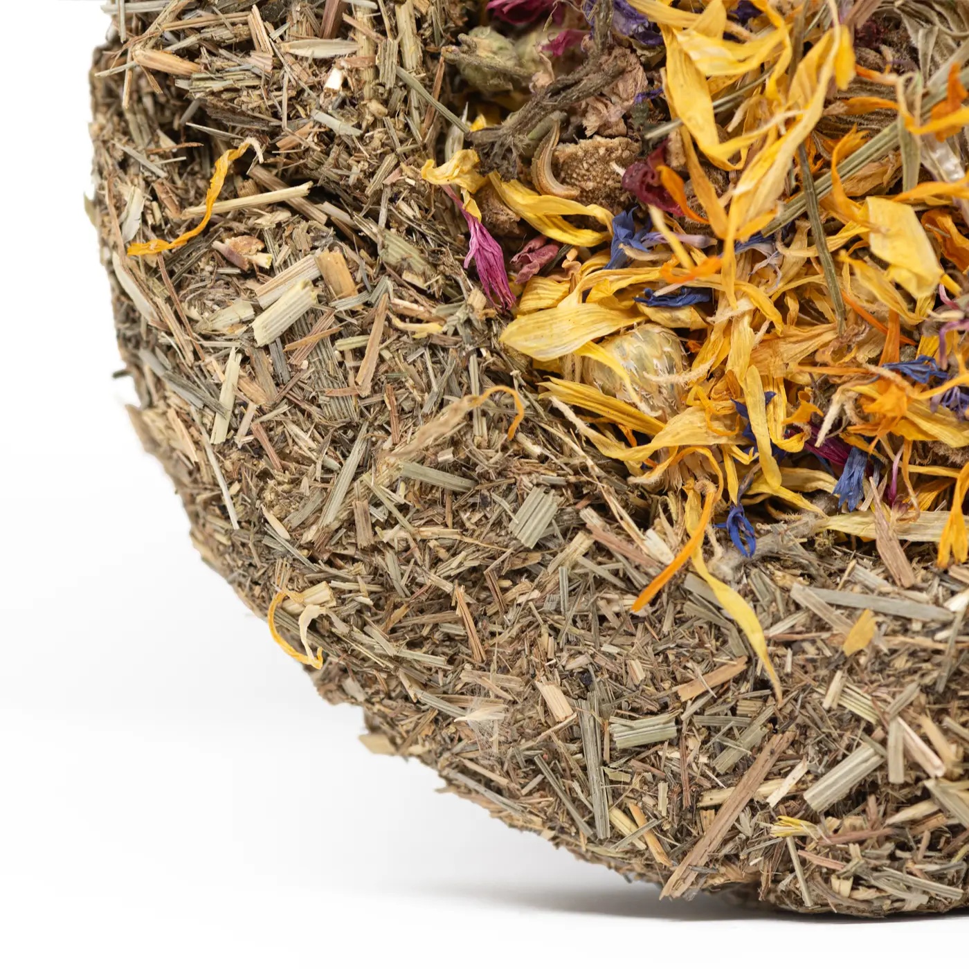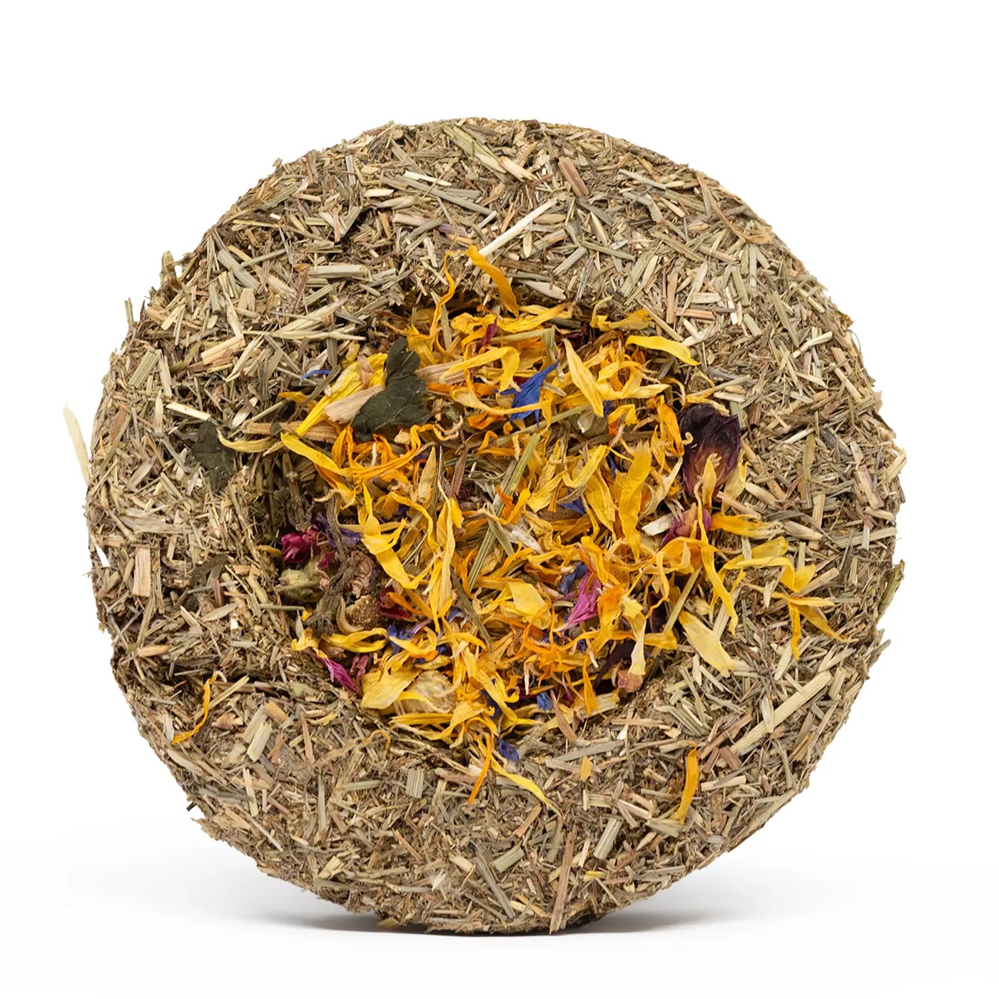 Composition: Meadow Grass, Timothy Hay, Plant-Based Binder, Pea, Marigold, Hibiscus, Cornflowers, Rose, Blue Mallow, Chamomile, Mint, Parsley, Dandelion, Nettle.