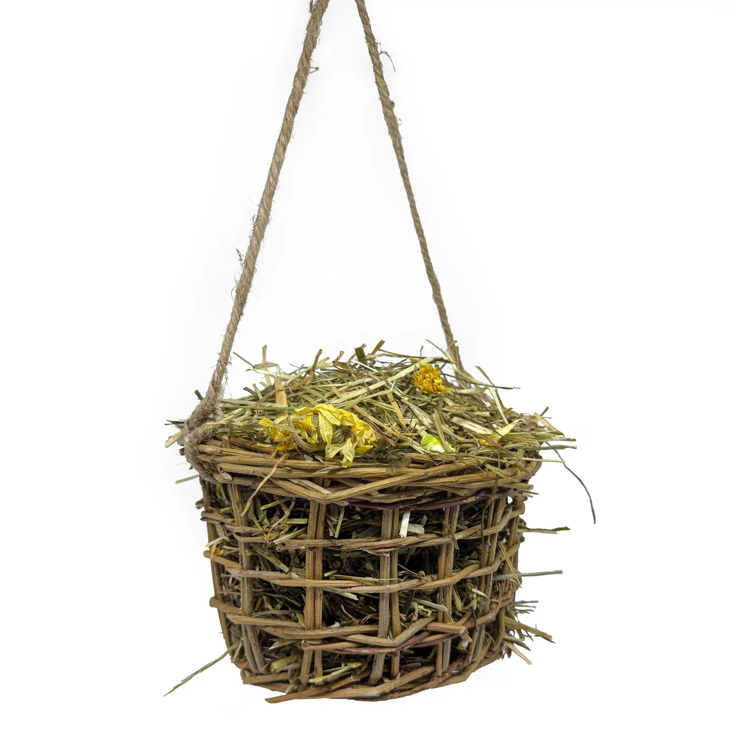 A chewable willow hay rack that encourages foraging, healthy eating, and dental wear for rabbits and small pets.