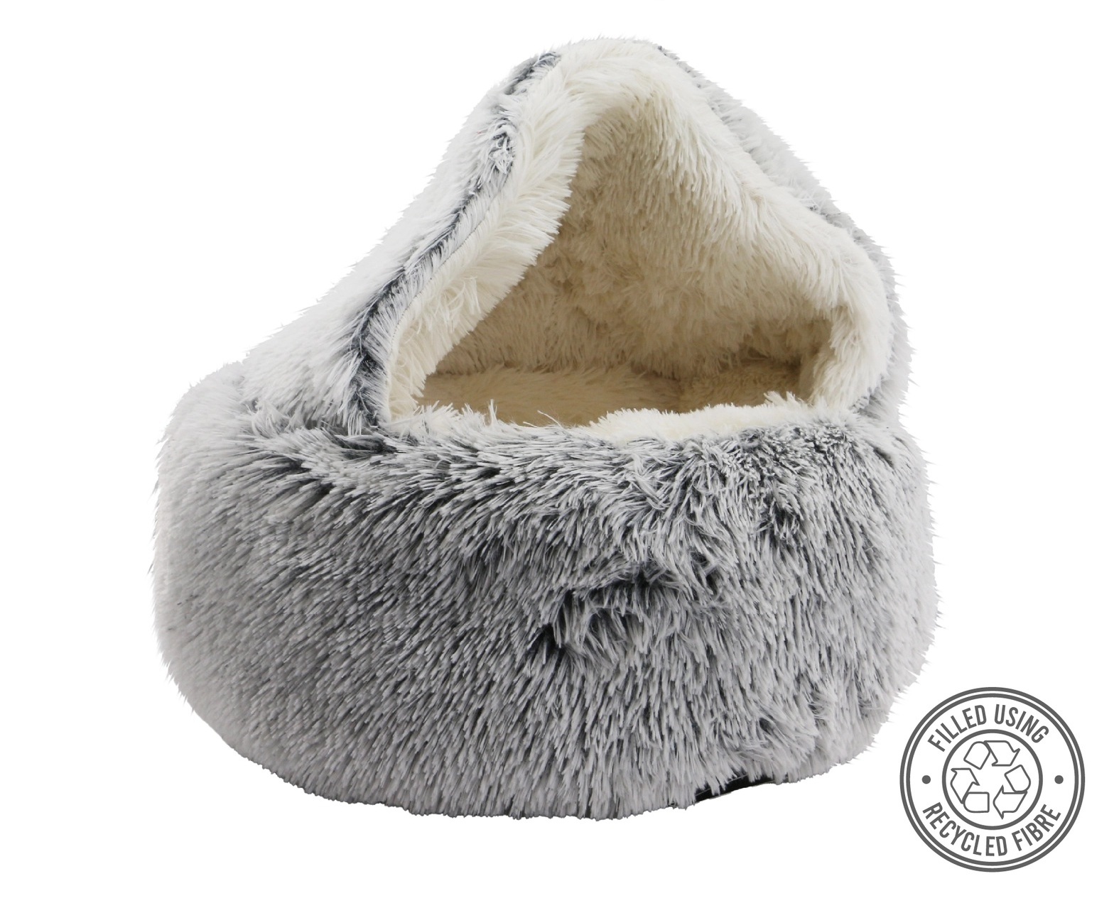 Luxurious cave-shaped pet bed with recycled stuffing. Ultra-soft, warm, and secure for cats and small dogs. Available now at PurePawsSupplies.