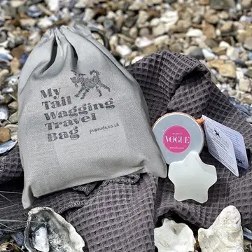 Compact travel kit for dogs featuring an anti-stink shampoo bar and cotton waffle towel — perfect for quick clean-ups on the go.